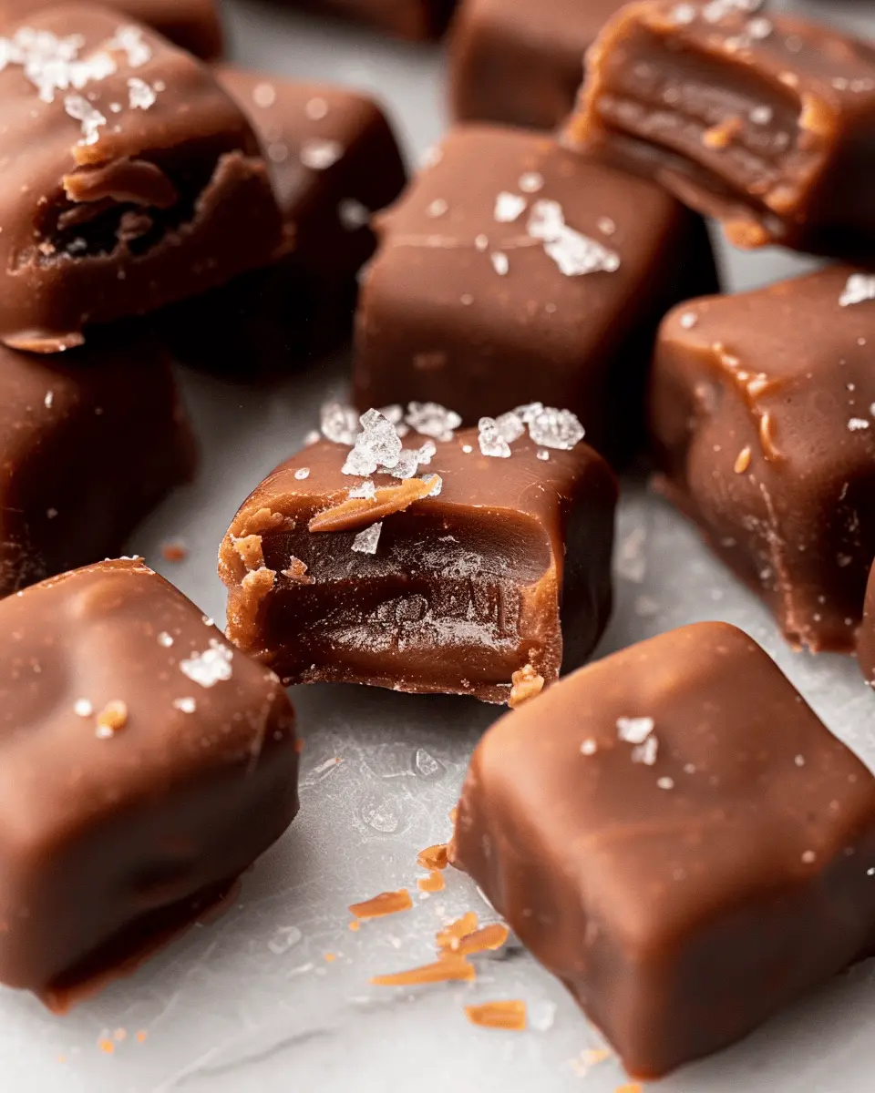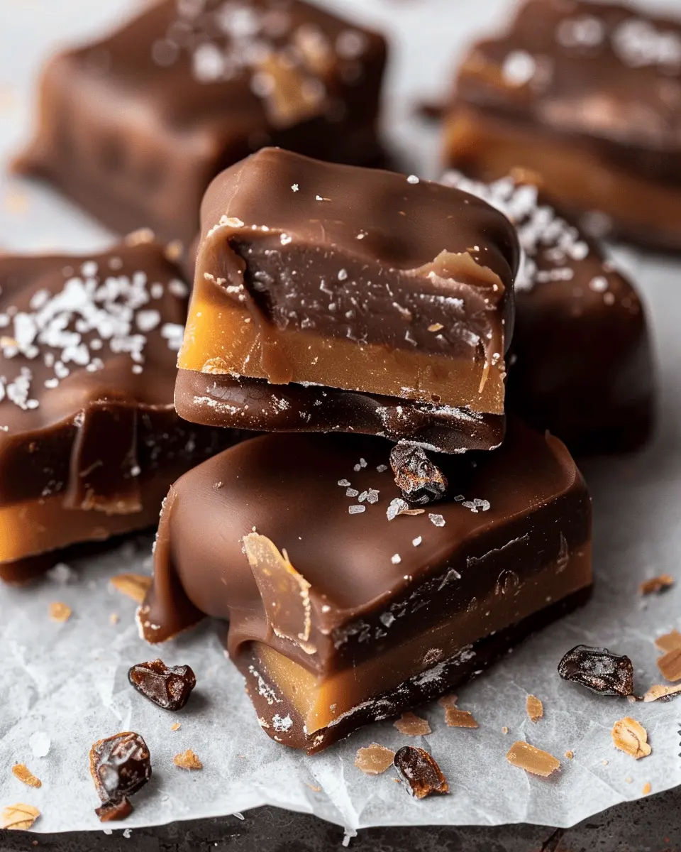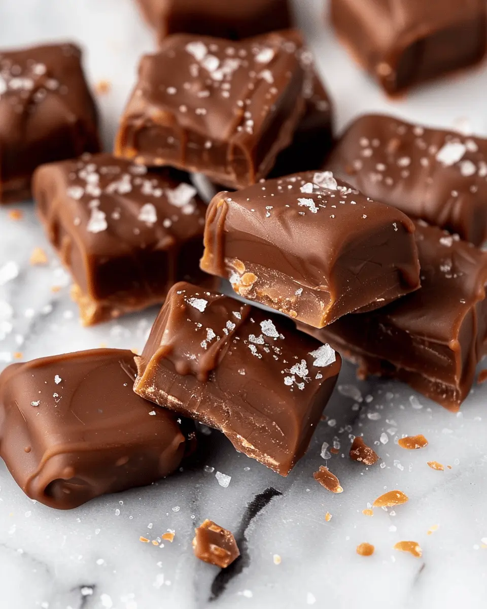 Dip each caramel square into the melted chocolate, allowing the excess to drip off. Place them on a baking sheet lined with parchment paper. For an extra touch, sprinkle some sea salt or chopped nuts on top while the chocolate is still wet.