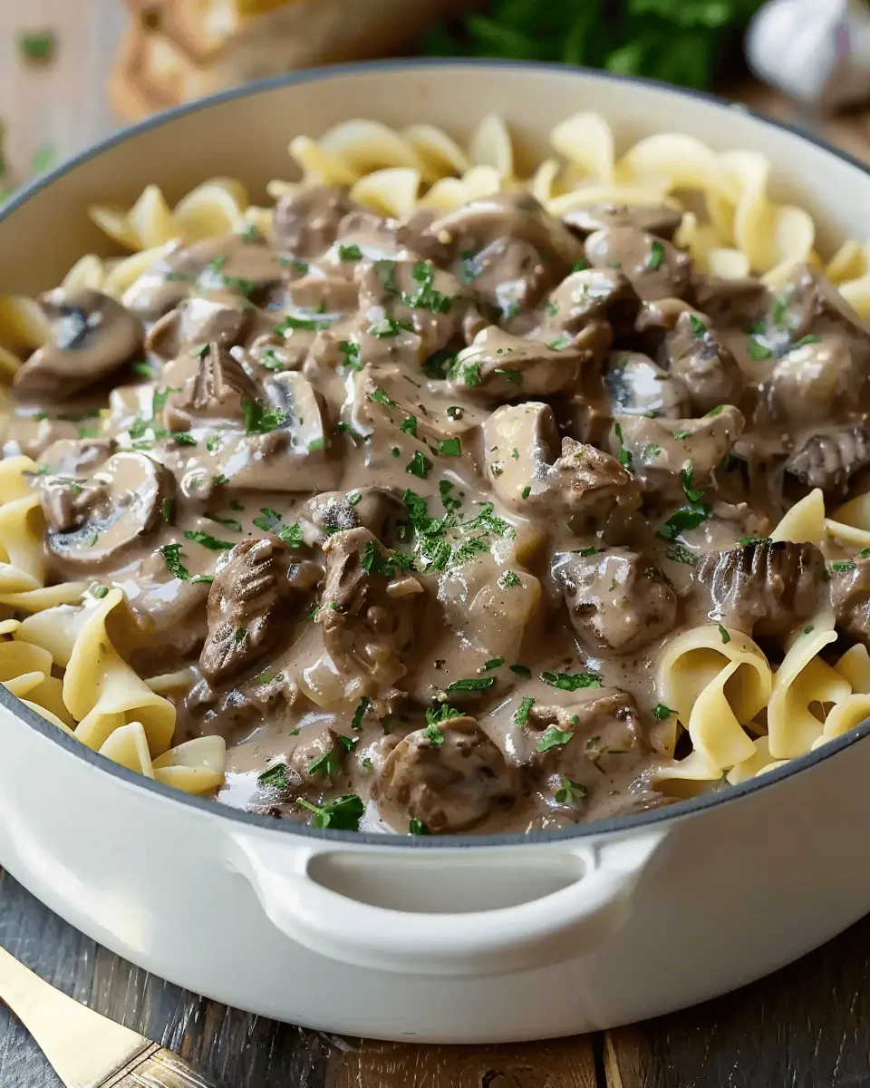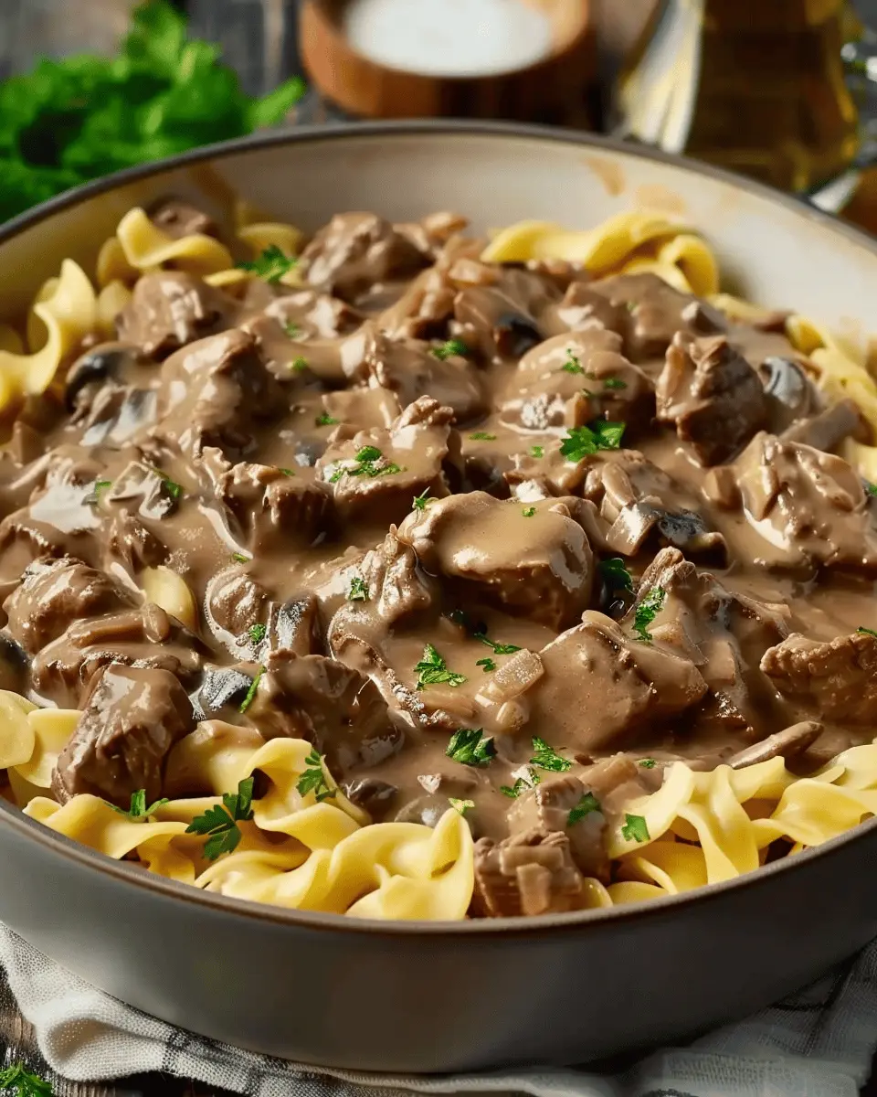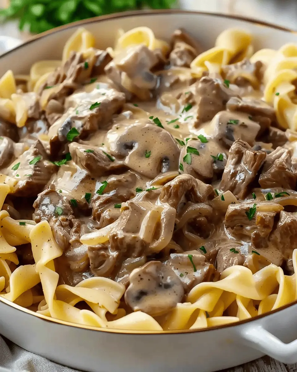 Now that your beef stroganoff with noodles is complete, it’s time to serve! Pair it with your favorite noodles—egg noodles are traditional, but feel free to use any pasta you enjoy. To garnish, sprinkle fresh parsley or chives for a pop of color. Serve hot, and watch as your guests savor every bite.