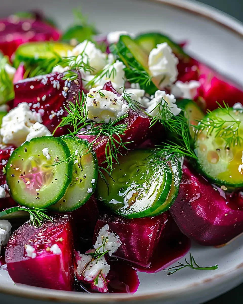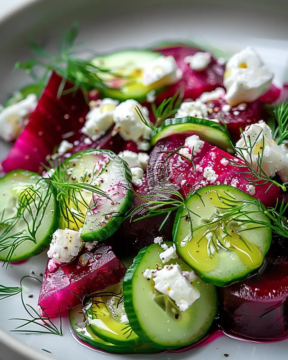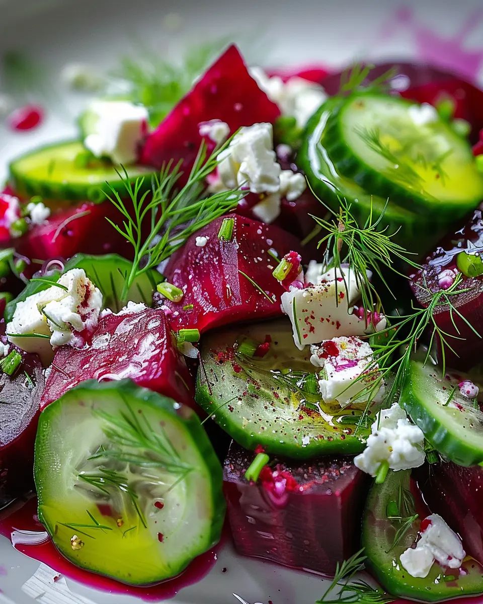 A vibrant salad combining the earthy sweetness of beets, the creaminess of feta, and the crunch of cucumbers, all enhanced with fresh dill.