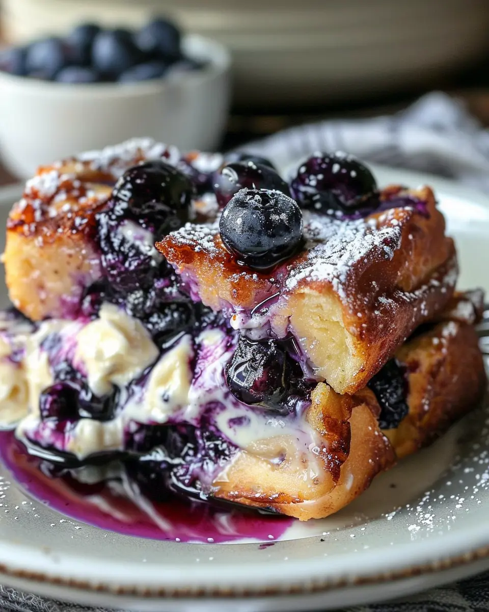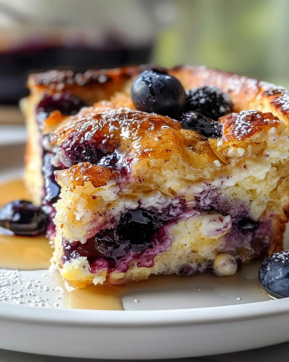 Indulge in a delightful blueberry cream cheese French toast casserole that combines the goodness of creamy cheese with the burst of fresh blueberries.