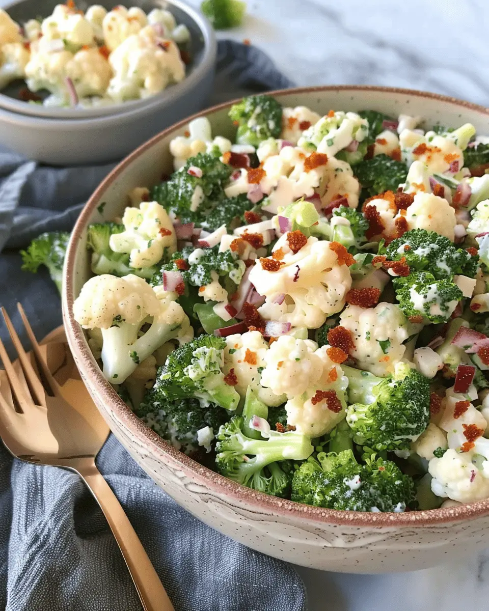 Enjoy a delightful twist on a classic salad with this Broccoli Cauliflower Salad featuring crispy turkey bacon.