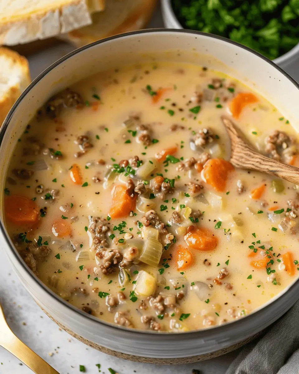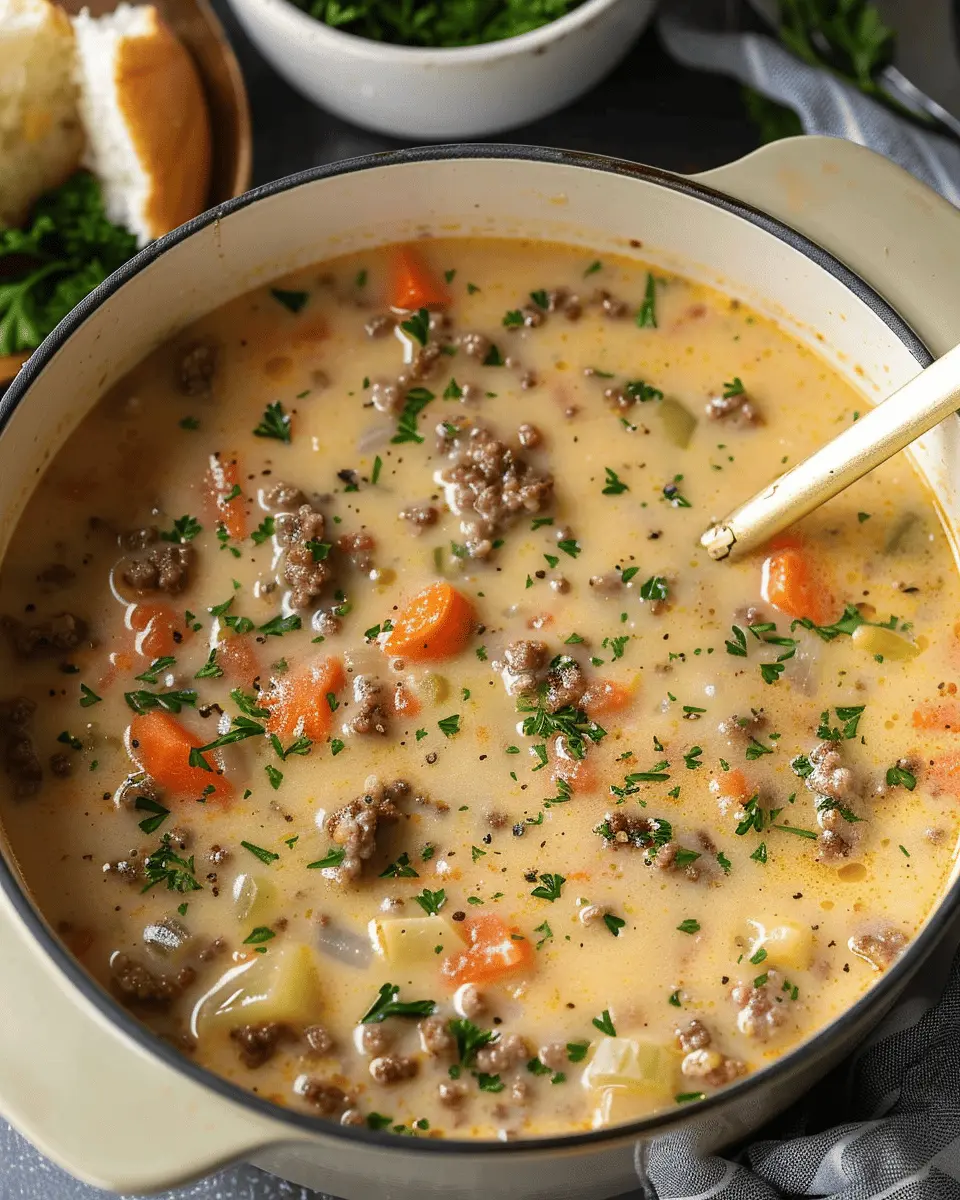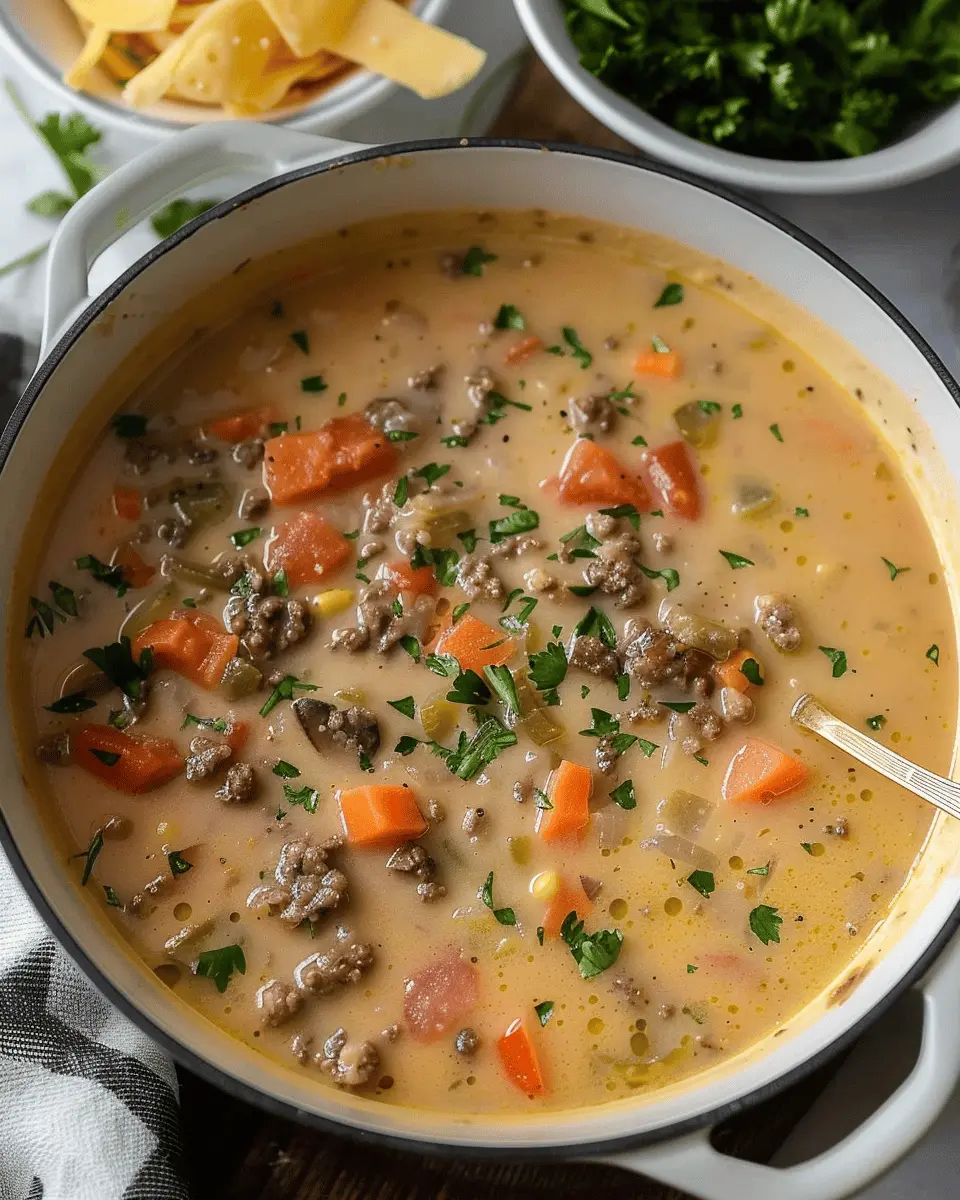 And there you have it! A warm, comforting bowl of cheeseburger soup that not only satisfies your hunger but also takes you on a nostalgic culinary ride. Serve with croutons or fresh bread for a complete meal. Enjoy!