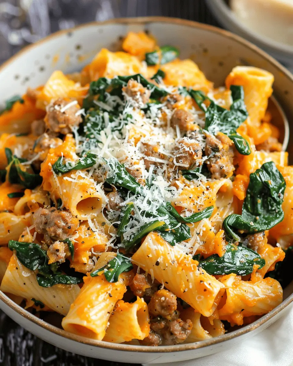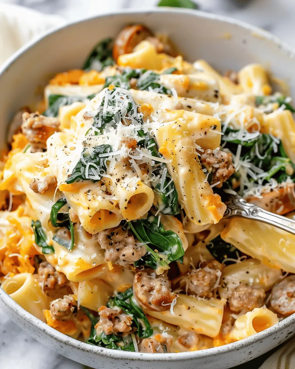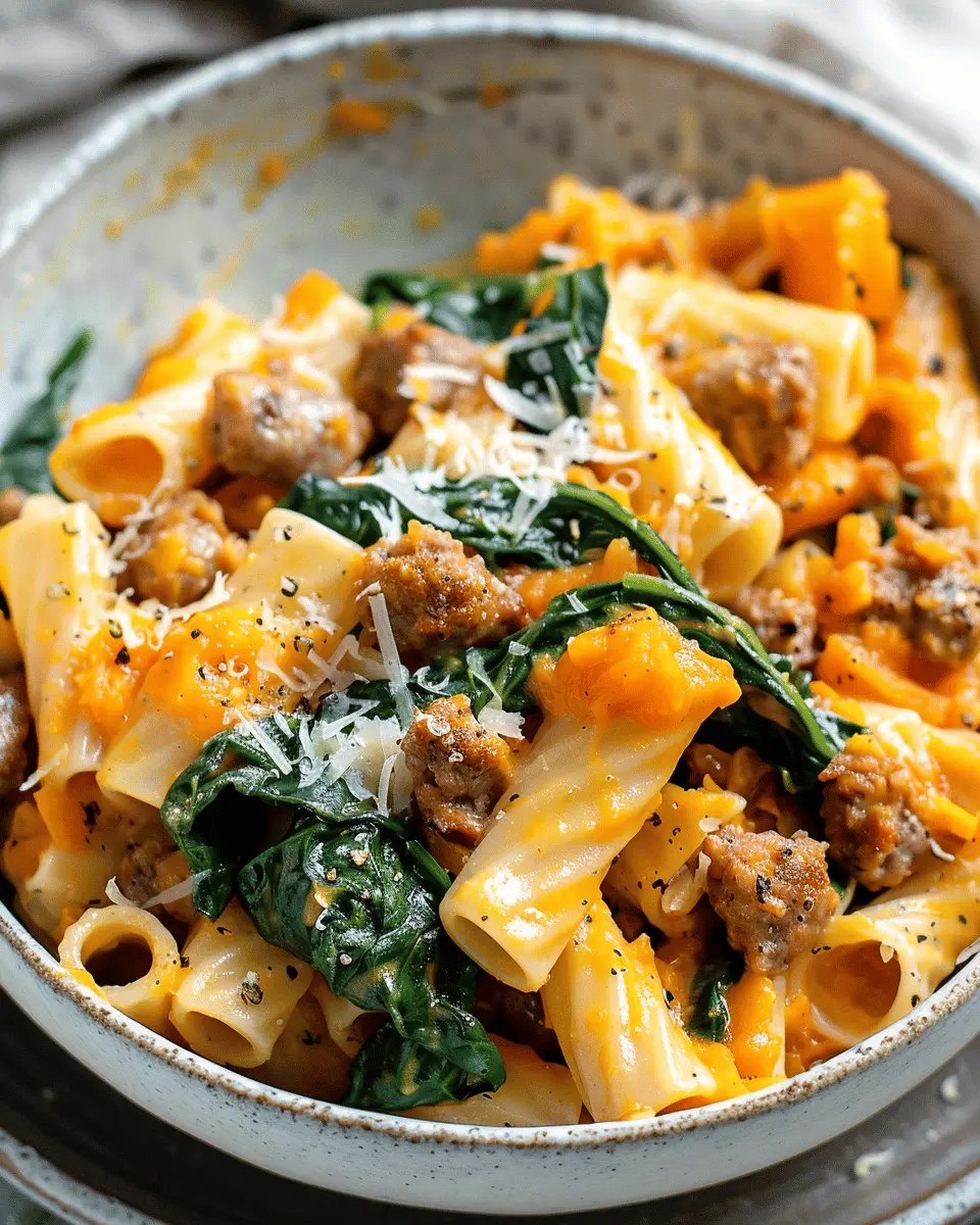 Indulge in a rich and creamy butternut squash pasta dish featuring savory sausage and fresh spinach, perfect for a comforting meal.