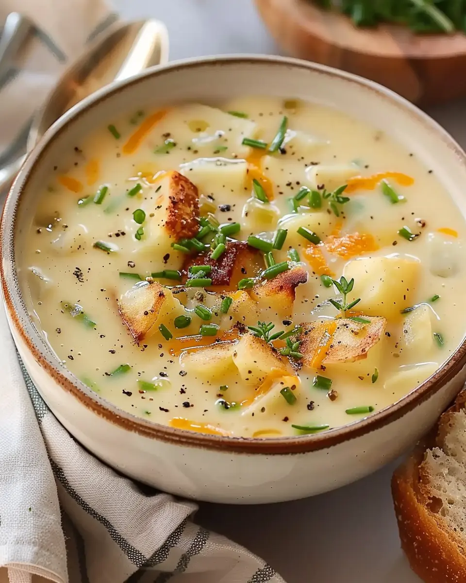 Finally, it’s serving time! Ladle the creamy potato soup into bowls and add a sprinkle of fresh parsley or chives for a pop of color. Pair it with some crusty bread or a garden salad for a complete meal that’s sure to impress anyone at your dinner table. Trust me, you’ll want to get seconds!