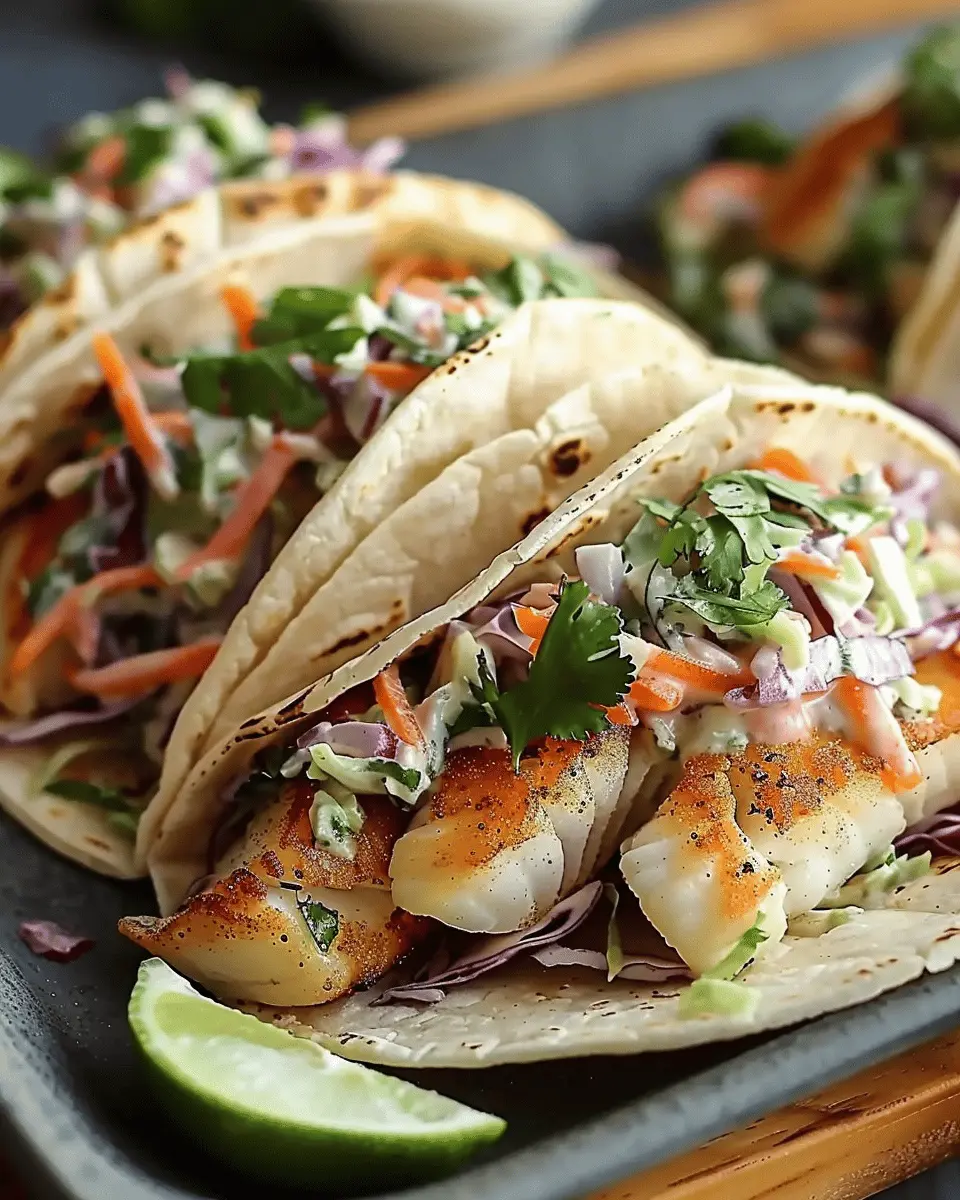 Keywords: fish tacos, cilantro lime slaw, easy tacos, flavorful tacos