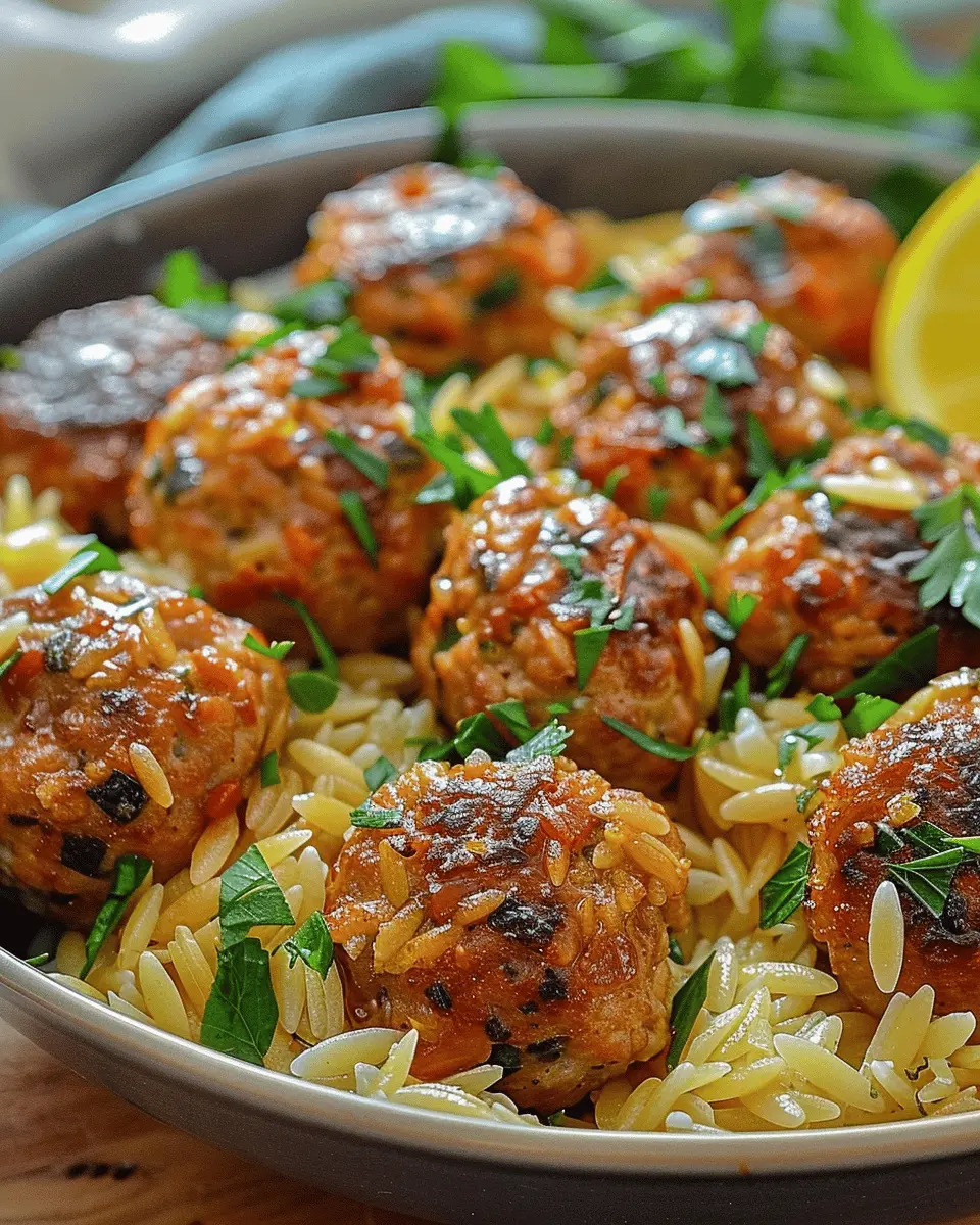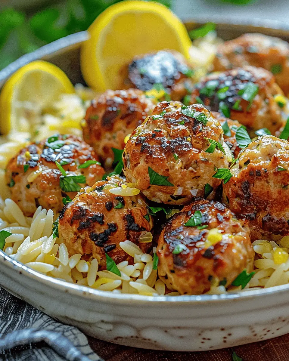 Delight in the flavors of these Greek Chicken Meatballs served with zesty lemon orzo, perfect for any meal.