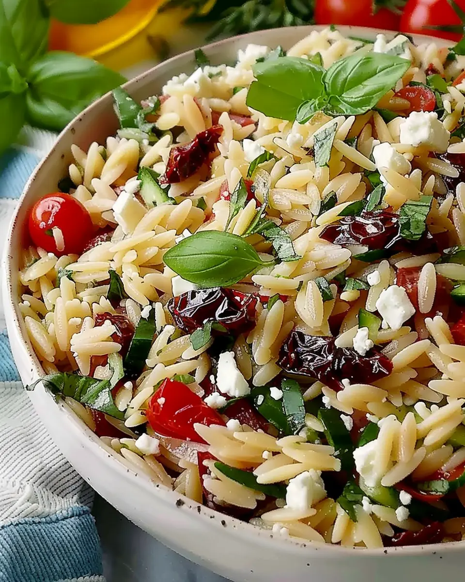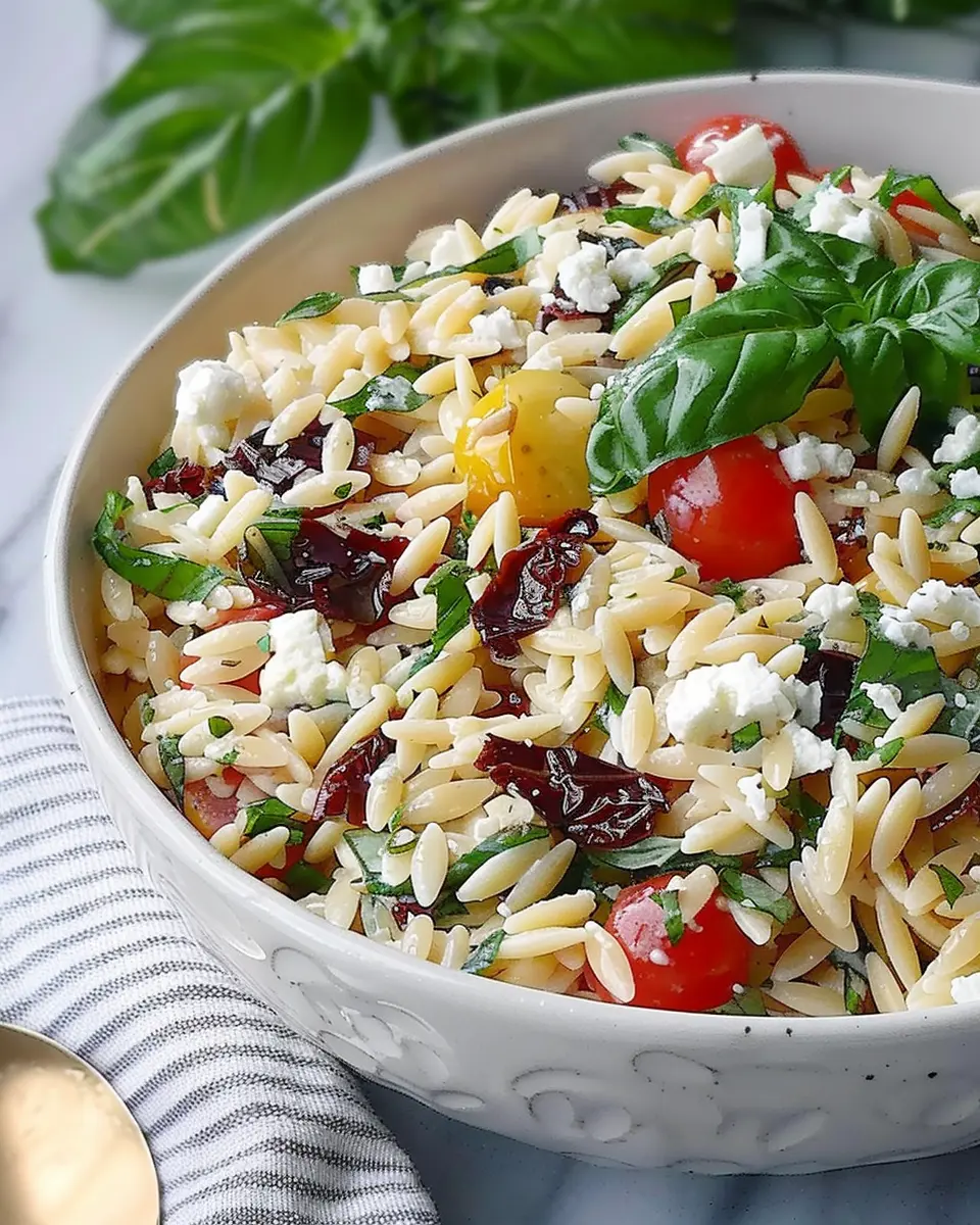 A delightful blend of orzo pasta, feta cheese, and sun-dried tomatoes, perfect for a refreshing meal.