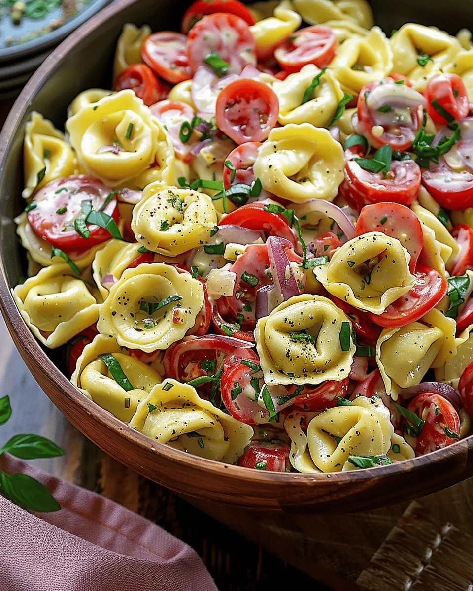 This Italian Grinder Tortellini Pasta Salad is a delightful mixture of flavors and textures, featuring turkey bacon, fresh vegetables, and a tangy dressing.
