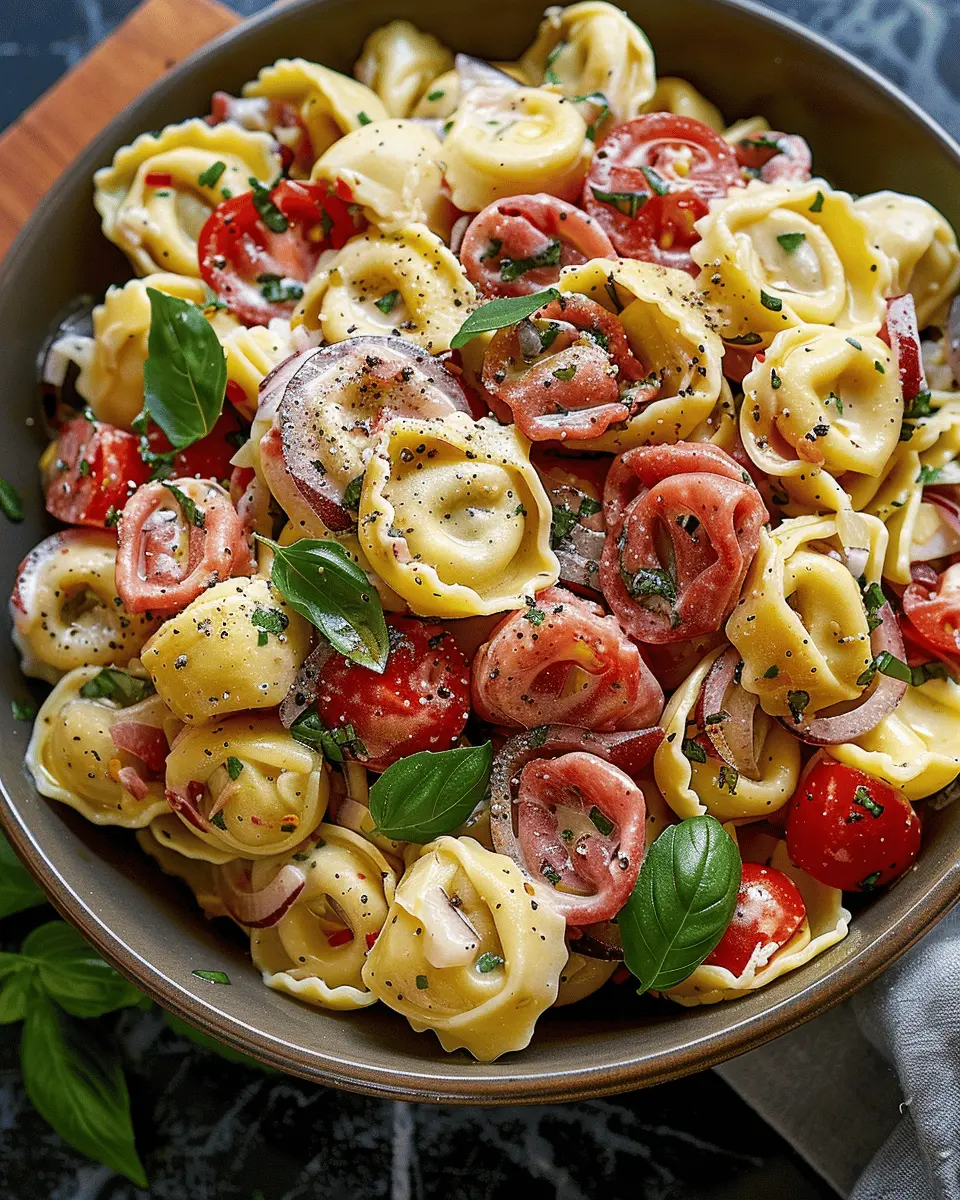 Combine the cooled tortellini in a large mixing bowl along with your dressing. This is where the magic starts to happen, as the tortellini absorbs those delightful flavors.