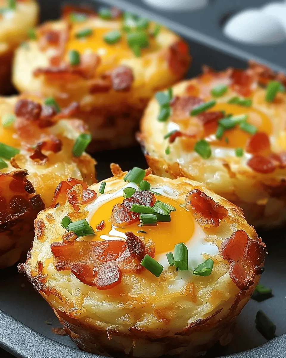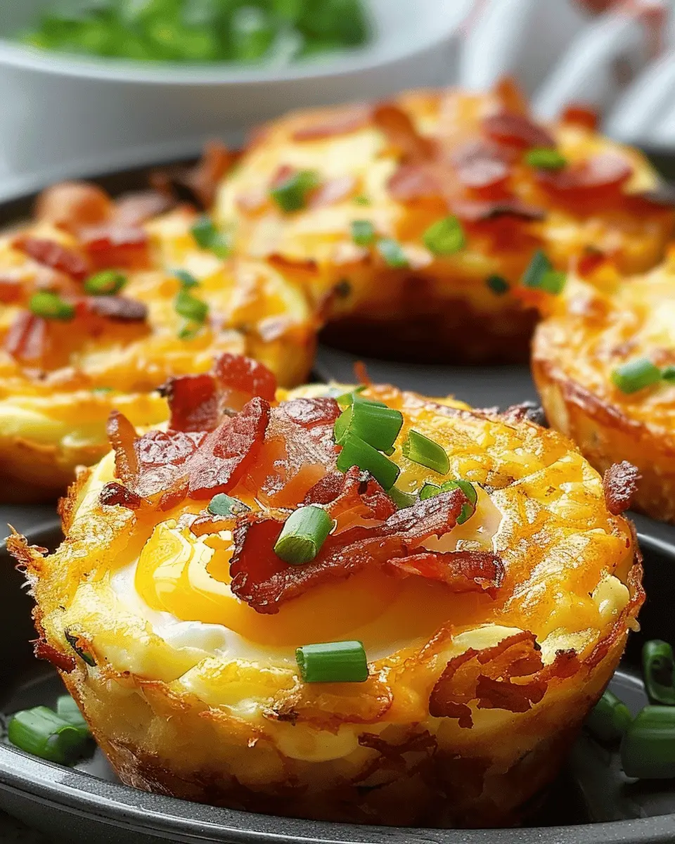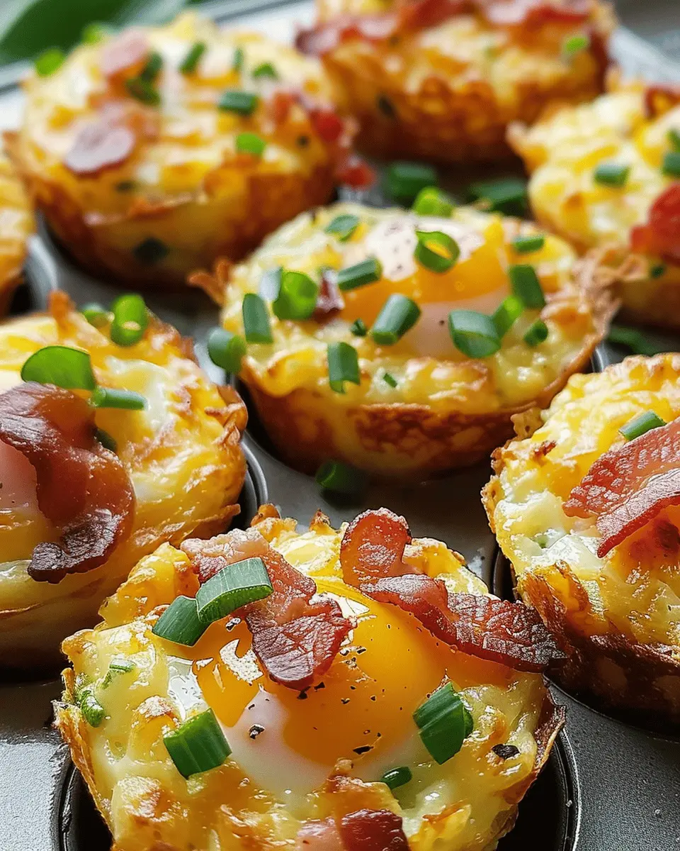 Deliciously loaded muffins featuring crispy hash browns, turkey bacon, and eggs, perfect for a hearty breakfast or brunch.