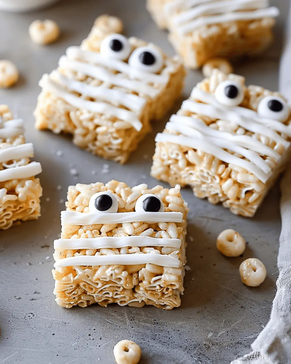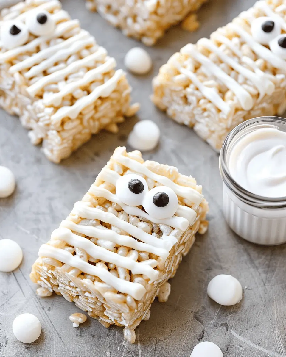 These treats are perfect for sharing at your Halloween parties or for an at-home movie night. Plus, they can be customized with various toppings! For more creative Halloween ideas, check out this fun article on the Food Network. So, grab your ingredients and get ready to impress your guests with these charming Mummy Rice Krispie Treats!