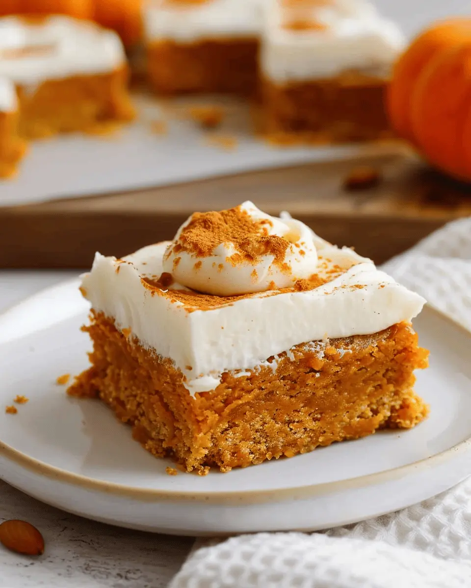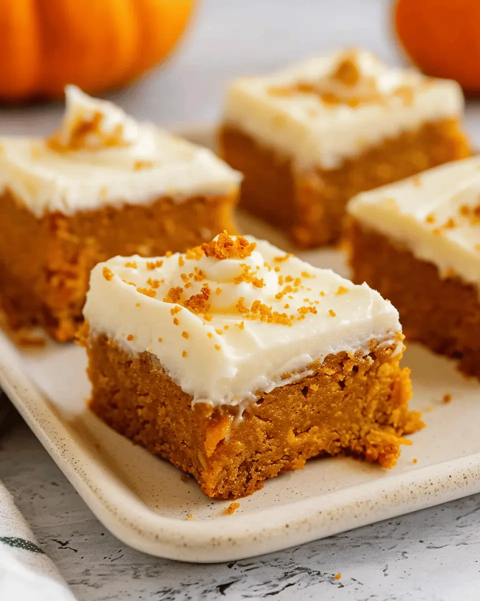 - Spread the frosting over the cooled pumpkin bars and cut into squares to serve.