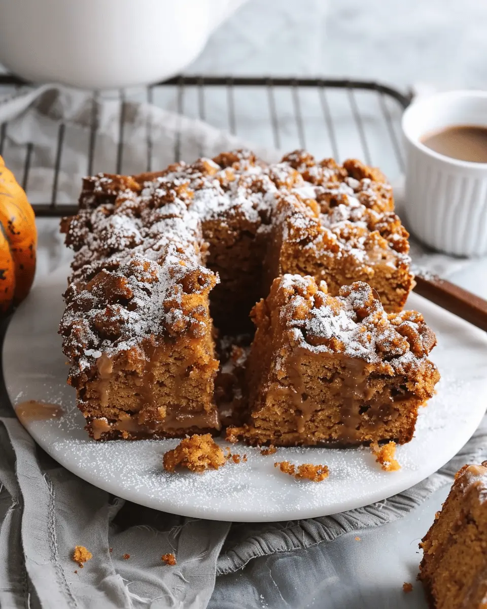 Indulge in a warm slice of Pumpkin Coffee Cake that perfectly combines the flavors of pumpkin spice and coffee, making it a delightful treat for any cozy morning.
