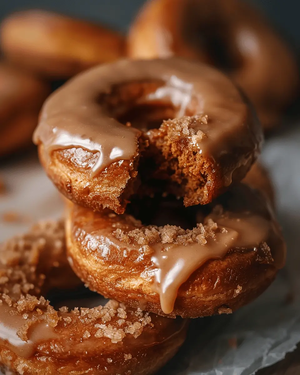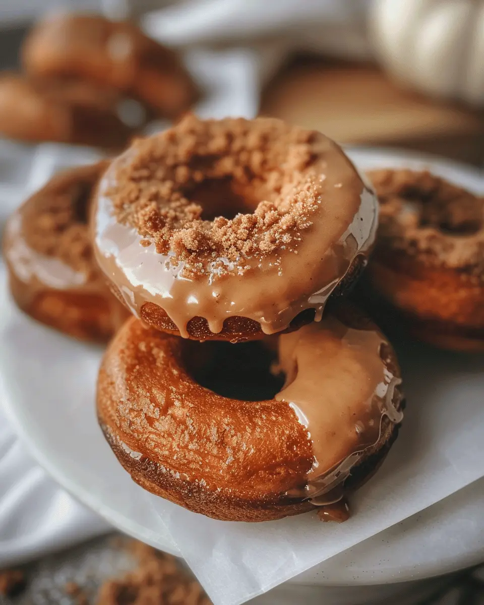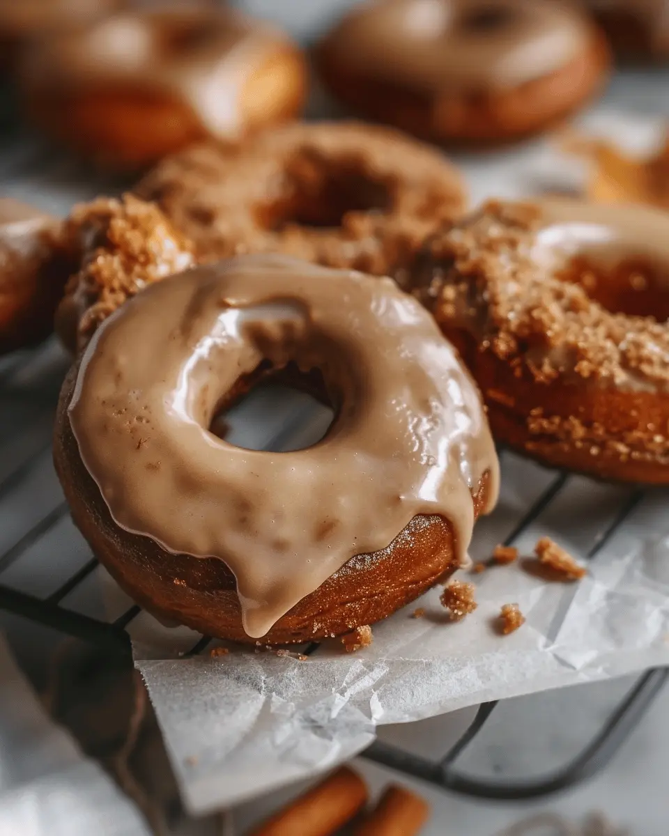 Indulge in these delicious pumpkin donuts topped with a rich brown sugar glaze that perfectly captures the essence of fall.