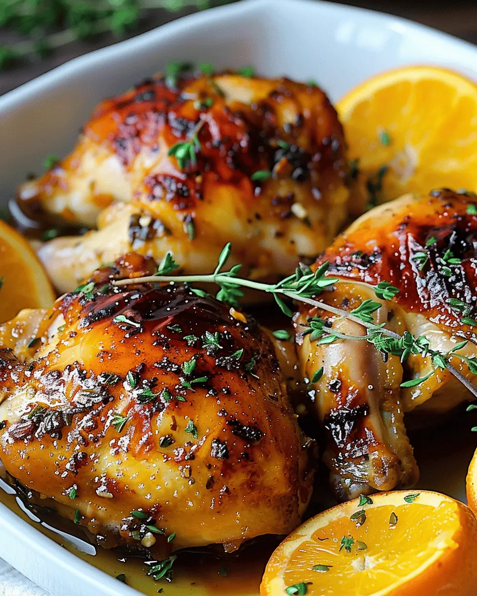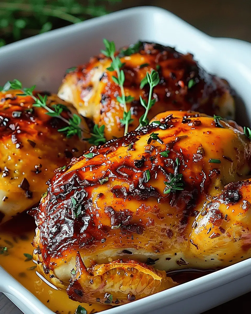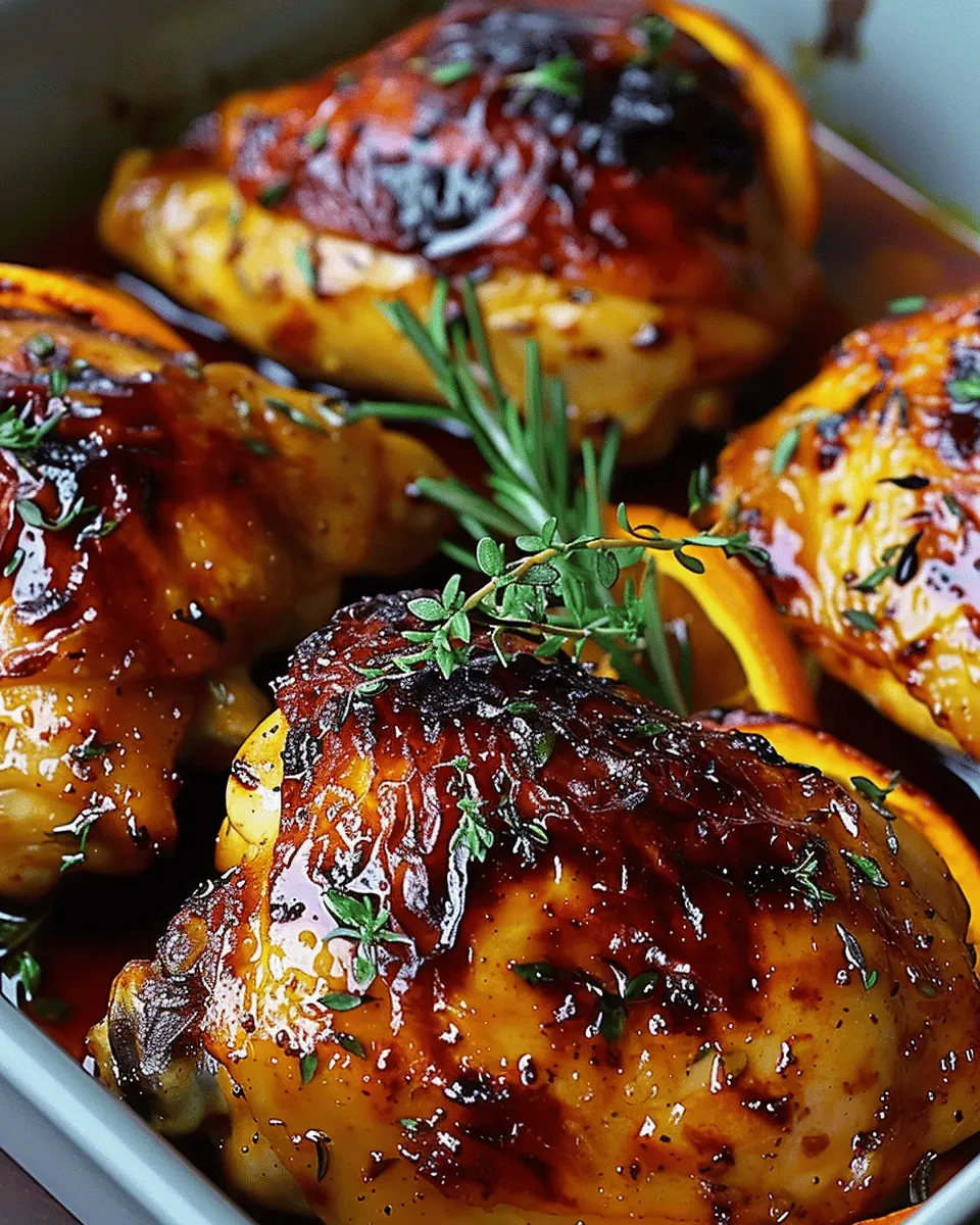 • Optional: Toss in orange slices and fresh herbs like thyme or rosemary around the chicken for added fragrance and presentation.