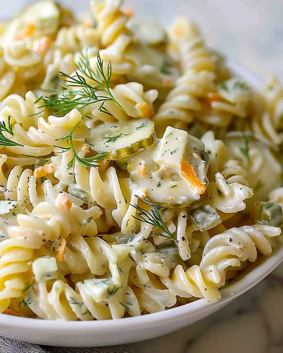 Unforgettable Flavor: The zesty, tangy flavor of dill pickles combined with creaminess and a hint of spice elevates this pasta salad to a whole new level. You won’t find another dish quite like it!