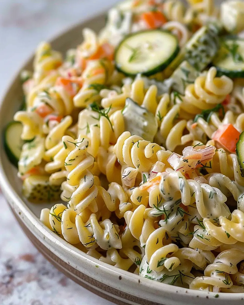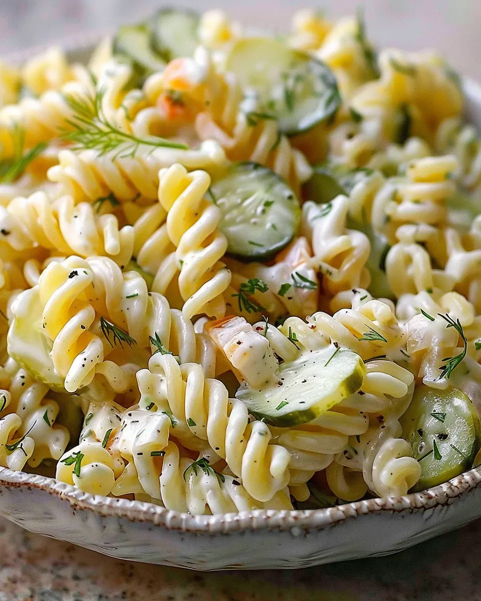 A delicious and refreshing pasta salad featuring dill pickles and turkey bacon, perfect for a quick meal or side dish.