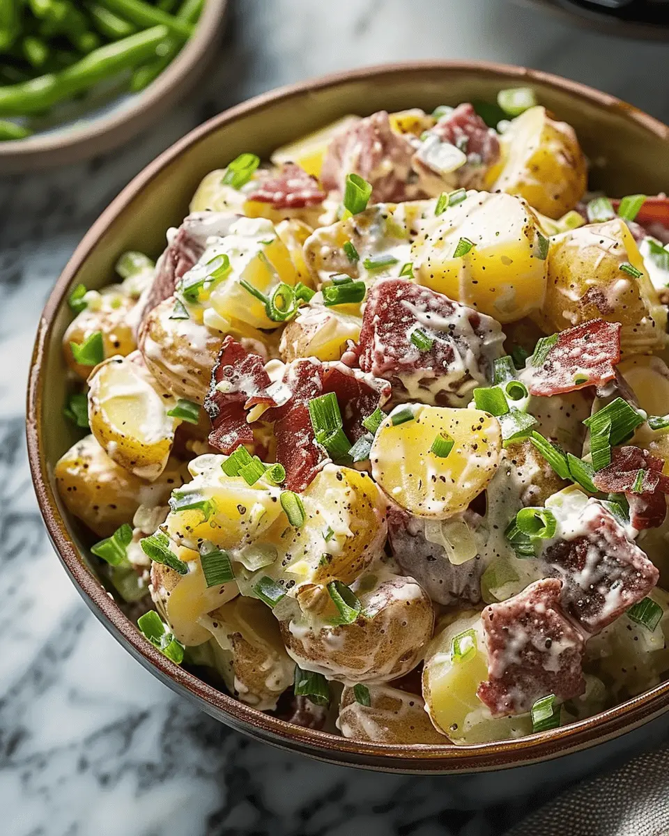 PrintSteakhouse Potato Salad: Easy Recipe with Turkey Bacon & Chicken Ham