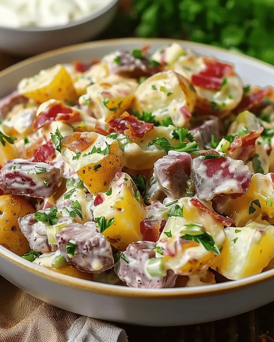 PrintSteakhouse Potato Salad with Turkey Bacon: A Creamy Delight