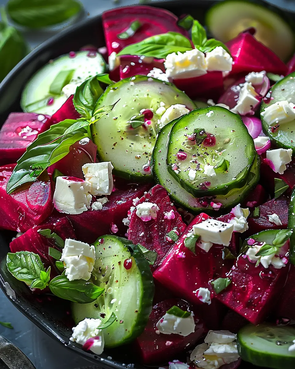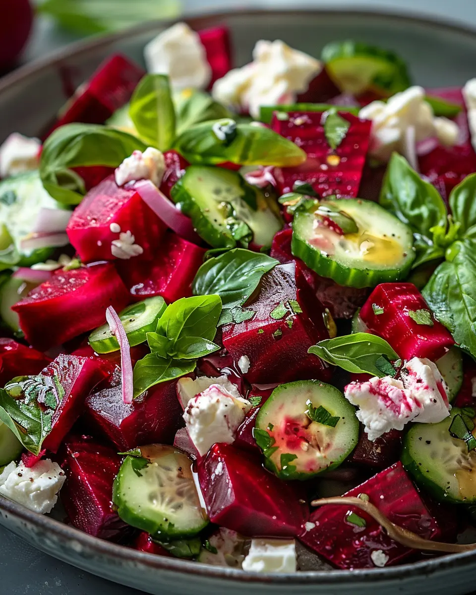 A refreshing salad combining earthy beets, creamy feta, and crisp cucumbers, perfect for any occasion.